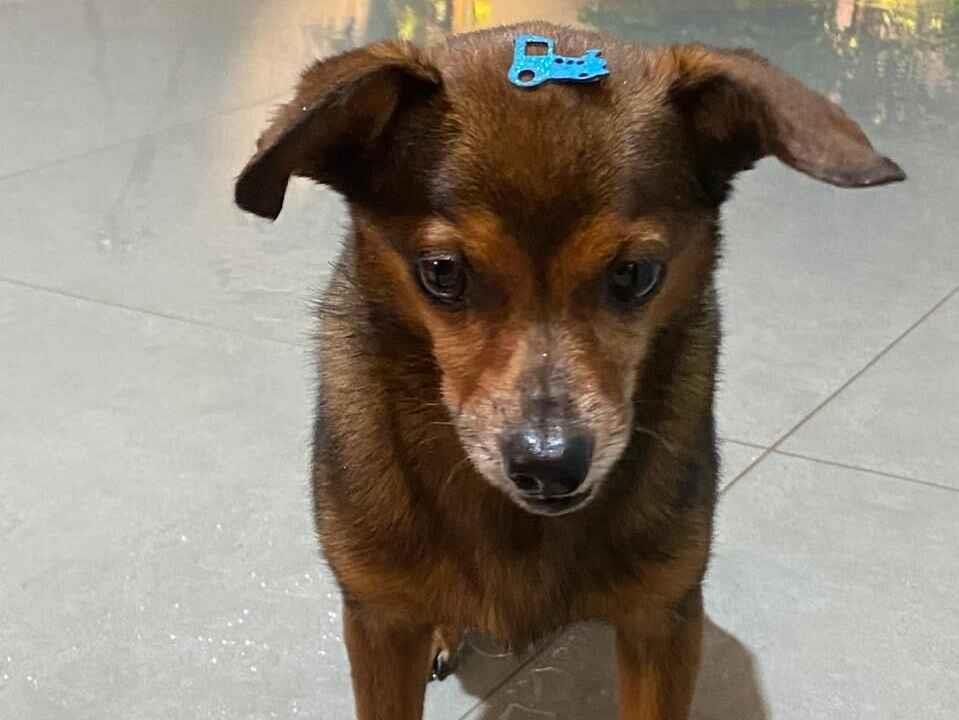 Cachorrinho encontrado na Rua Doutor Júlio Cardoso, centro, Franca SP, macho, pequeno, enfeite azul na cabeça.